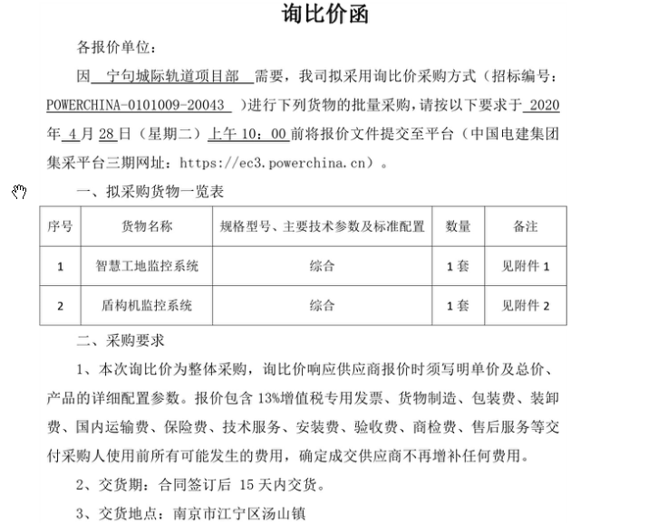 中国电建水电一局铁路分局宁句城际轨道项目监控系统采购项目询价公告