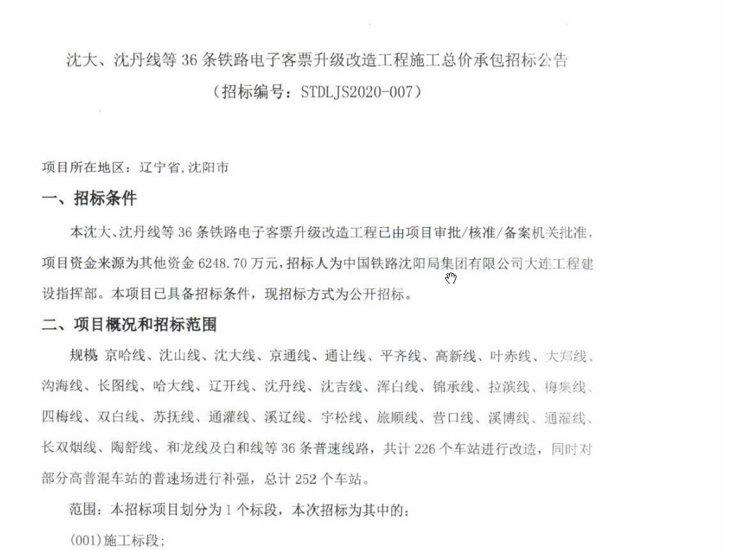 辽宁沈大、沈丹线等36条铁路电子客票升级改造工程施工总价承包招标公告