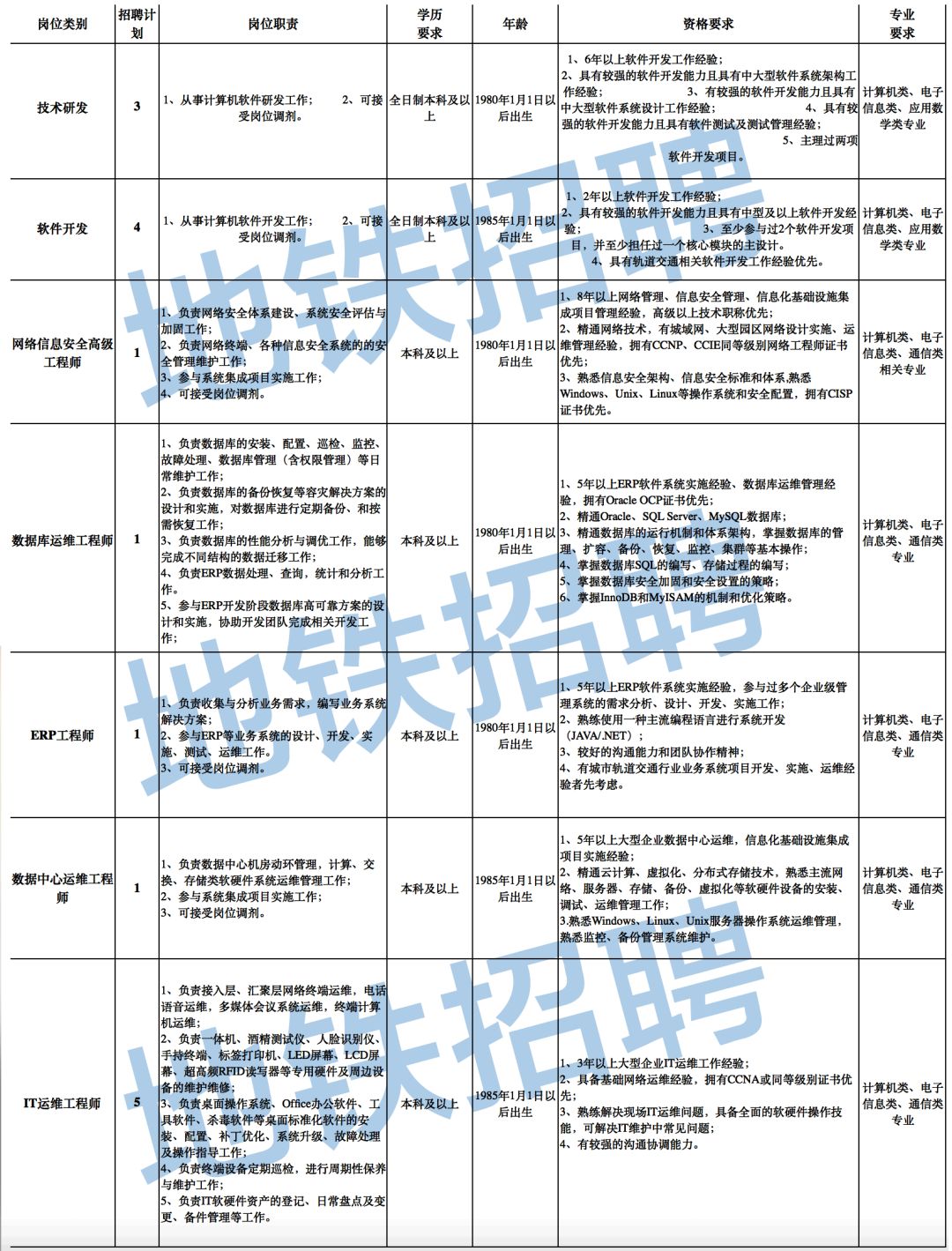 因工作需要,现面向全社会范围吸纳科技创新型人才,我们将遵循公平、公正的原则择优录用,欢迎有志于青岛地铁科技事业的优秀人才积极报名应聘。相关招聘事宜如下: