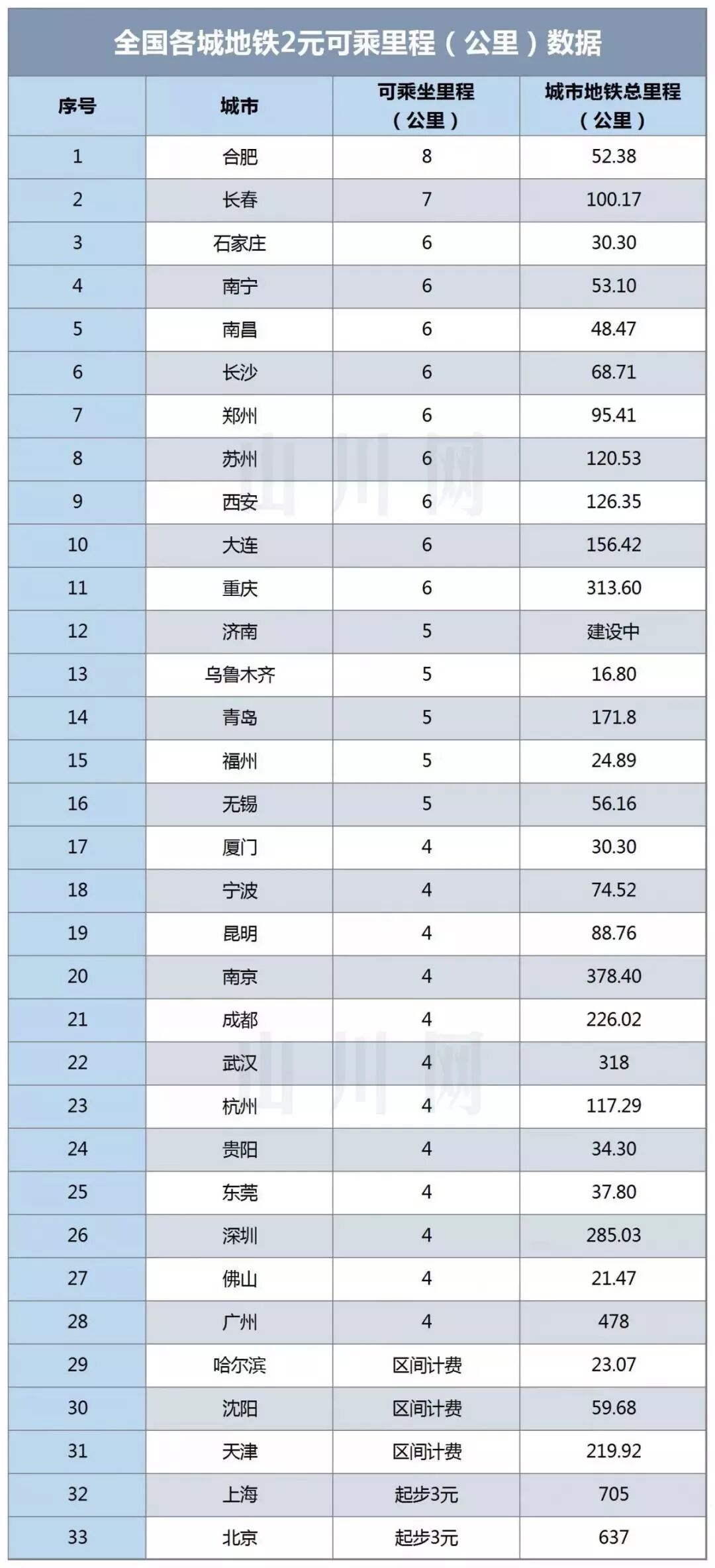 关于全国地铁2元可乘坐里程的图,