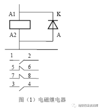 在电路图中电磁继电器的表示方式如图(1)所示。图中的长方形表示电磁线圈,A1-A2是电磁线圈的两端,其中A1接+110V,A2接地。K是二极管的阴极,A是二极管的阳极,二极管跟电磁线圈是