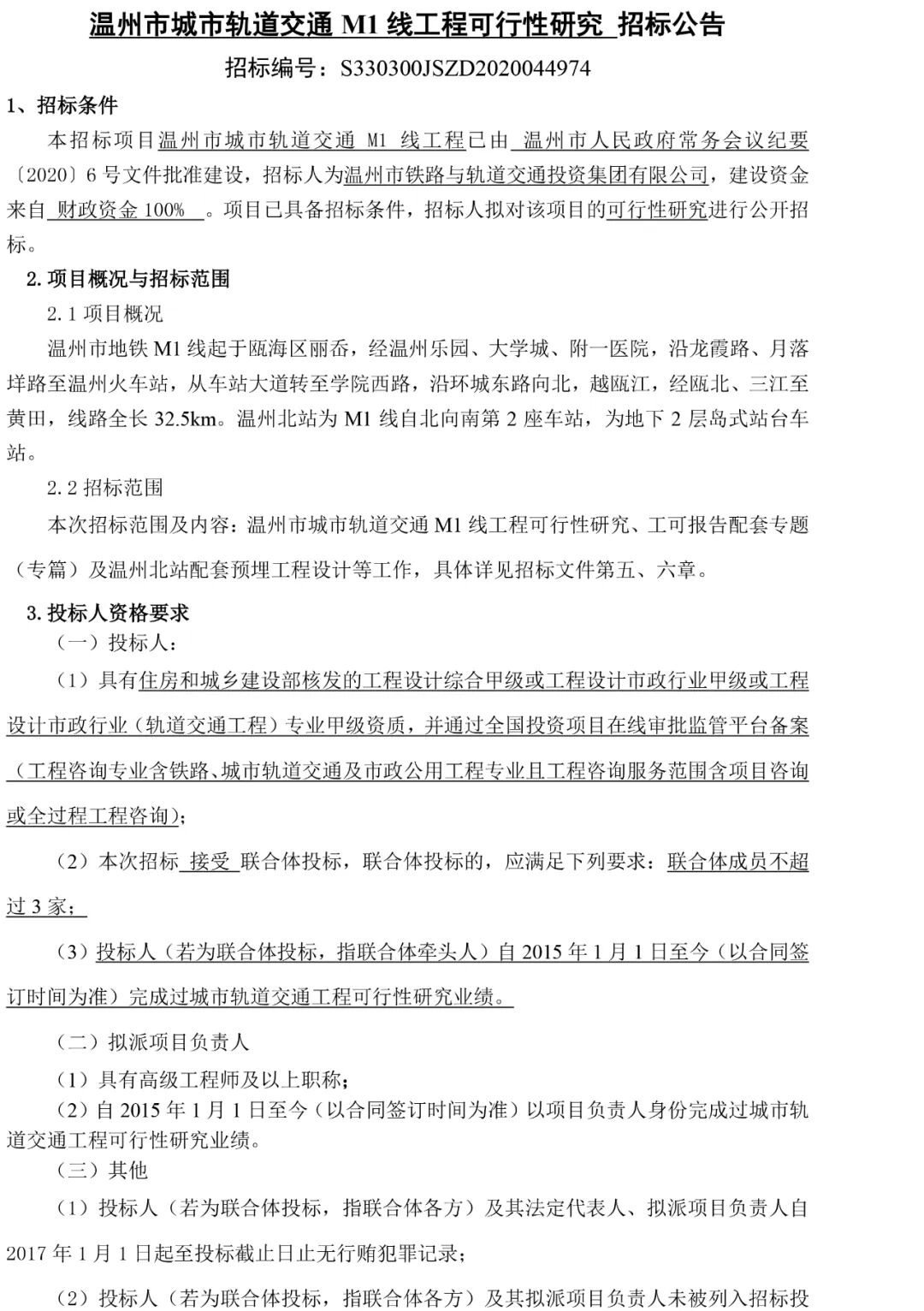 温州市城市轨道交通M1线工程可行性研究招标