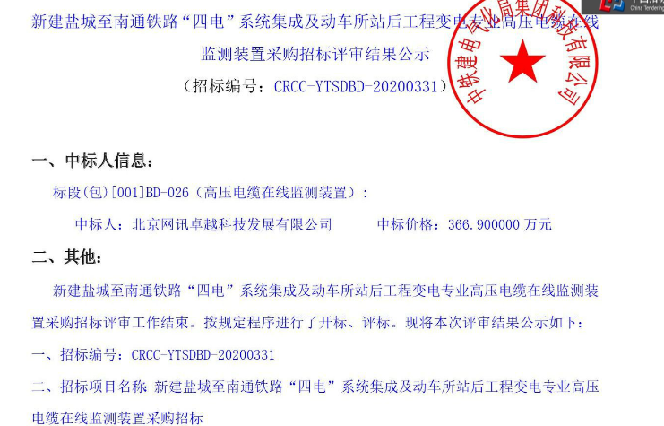 新建盐城至南通铁路“四电”系统集成及动车所站后工程变电专业高压电缆在线监测装置采购