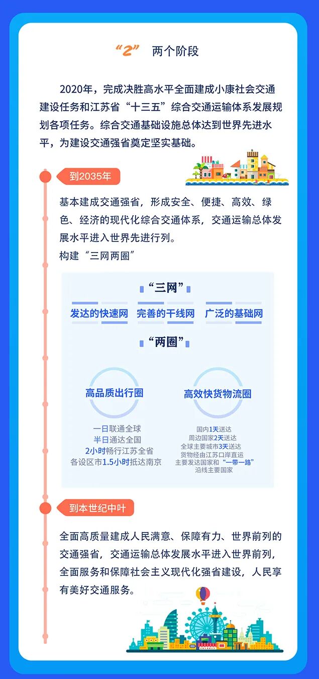 到2035年,基本建成交通强省,形成安全、便捷、高效、绿色、经济的现代化综合交通体系,交通运输总体发展水平进入世界先进行列。交通运输安全达到国际先进水平,无障碍出行服务体系基本建成,有效保障经济安全、国土安全、生态安全和维护国家权益。交通基础设施网络便捷化程度居世界前列,拥有发达的快速网、完善的干线网、广泛的基础网,天地一体的交通控制网基本形成,高快速铁路基本覆盖所有县级及以上节点。交通客货运输高效连接全国、全球,构建“高品质出行圈”,基本实现一日联通全球,半日通达全国,2小时畅行江苏全省,各设区市1.5小时抵达南京;构建“高效快货物流圈”,基本实现国内1天送达、周边国家2天送达、全球主要城市3天送达,货物经由江苏口岸直运主要发达国家和“一带一路”沿线主要国家。交通运输绿色发展水平达到世界先进水平,交通网络结构显著优化,铁路、水运等集约运输方式在客货运输中的占比显著提升,铁路客运量占比达30%,铁路、水运货运周转量占比达70%以上。交通运输发展经济惠民,市场环境优良,物流总费用与地区生产总值比率下降到10%以下。