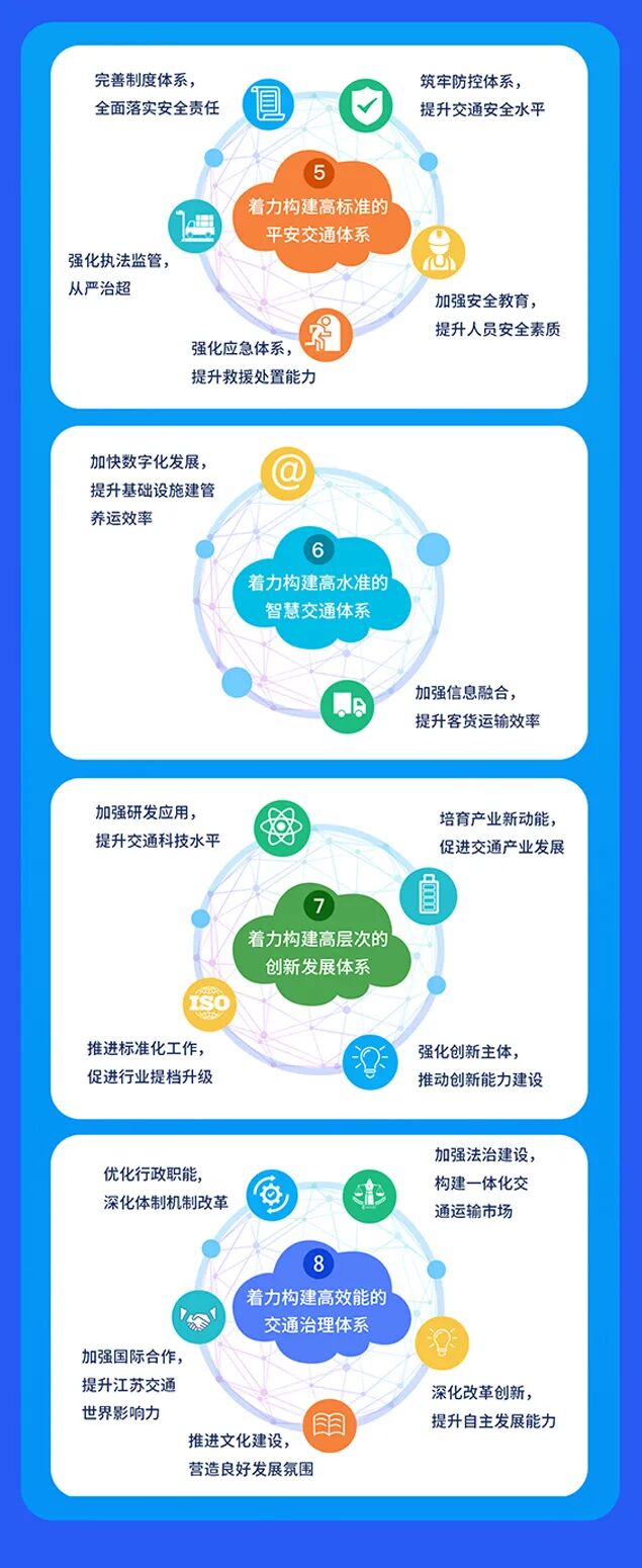 服务国家战略和江苏高质量发展要求,结合江苏交通发展实际,努力打造“一带一路”的交通标杆示范项目样板,重点建设连霍新亚欧陆海联运通道;打造长江经济带运输结构调整样板,重点发展公铁水、海江河联运;打造航运特色鲜明的大运河文化带样板,重点建设京杭大运河绿色航运示范区;打造综合交通运输改革发展样板,重点构建统筹协同的规划、建设、管理体制机制;打造枢纽经济发展样板,重点以优化重大枢纽布局推动产业发展;打造交通引领城市群发展样板,重点建设沿江城市群多层次轨道网;打造交通服务乡村振兴样板,重点建立“农村公路+”发展模式;打造创新驱动发展样板,推动行业发展质量变革、效率变革、动力变革;打造平安交通发展样板,重点实施科技兴安工程;打造交通品质工程样板,重点提升“十年路面百年桥”品牌优势。