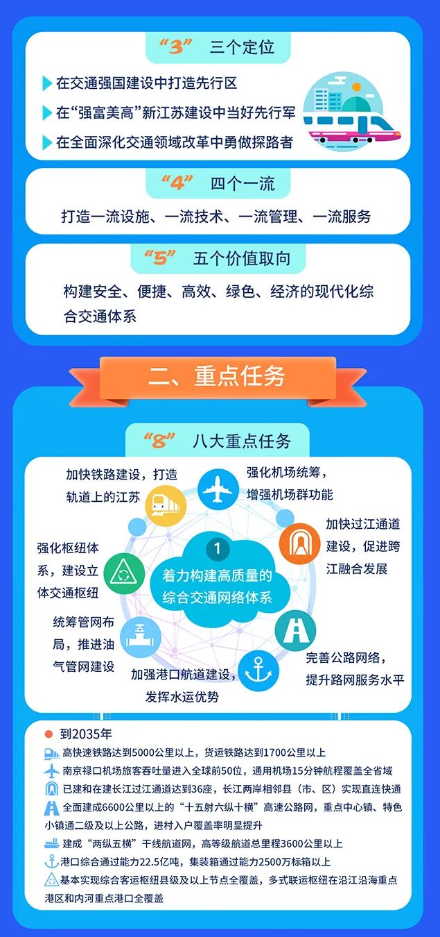 7.强化枢纽体系,建设立体交通枢纽。提升南京首位度,提升全球直达能力,建设区域性航运物流中心,构建直连全国的“米”字形高速铁路网,构筑南京都市圈轨道网。支持镇江、扬州融入南京都市圈枢纽布局。着力打造无锡、连云港、徐州全国性综合交通枢纽。提升苏州、南通、淮安等综合交通枢纽功能,苏州、南通打造成为以上海为核心的国际性综合交通枢纽的重要组成部分。支持常州、泰州、盐城、宿迁建设区域性综合交通枢纽。建设立体化枢纽场站集群。到2035年,基本实现综合客运枢纽县级及以上节点全覆盖,多式联运枢纽在沿江沿海重点港区和内河重点港口全覆盖。大力推动临港经济、临空经济和高铁经济发展。完善支撑和引领自贸区发展的综合交通运输体系。