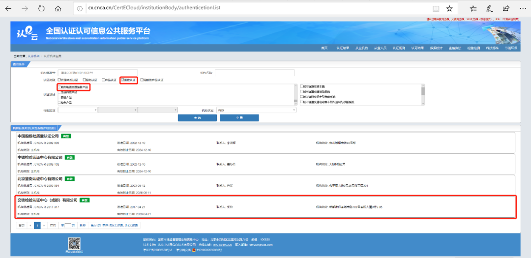 自“全国认证认可信息公共服务平台”查询获知,交铁检验认证中心(成都)有限公司已获批城市轨道交通装备产品认证资质(城市轨道交通装备产品认证,简称CURC认证),获批范围为城市轨道交通车辆、城市轨道交通牵引传动系统、城市轨道交通电动客车列车控制与诊断系统、城市轨道交通基于通信的列车运行控制系统(CBTC)。