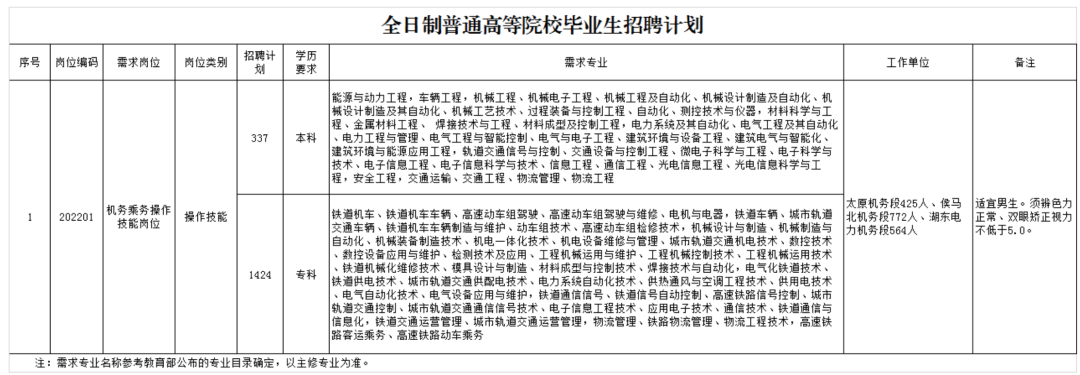 (五)须符合招聘岗位要求的其它条件。服从我公司对岗位的安排和调整,适应长期在铁路沿线、偏远山区、艰苦环境地区工作及户外、野外、倒班、夜班作业要求。