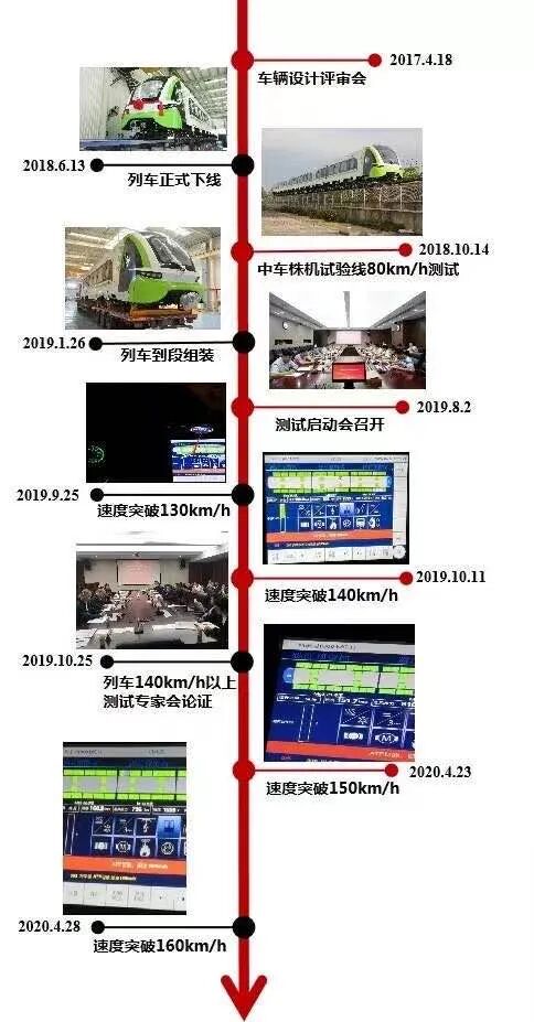 据中车株机公司磁浮研究所所长佟来生介绍,为确保测试安全,列车按照测试速度从低到高、循序渐进、逐级验证的原则,前期已完成了100km/h、120km/h、150km/h、155km/h 等 4 个速度等级的测试验证工作,测试工作组对各速度等级下的列车状态和线路实时监控数据进行了研究分析,得出了列车总体运行状态良好、线路监控数据正常、列车具备冲刺160km/h 条件的结论,最终列车顺利平稳地完成了160km/h的速度测试工作。