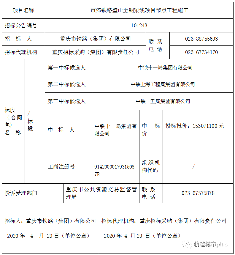 重庆市郊铁路璧山至铜梁线项目节点工程施工中标结果公示