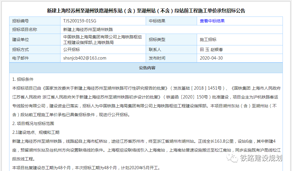 4月30日,《新建上海经苏州至湖州铁路湖州东站(含)至湖州站(不含)段站前工程施工单价承包招标公告》正式发布。