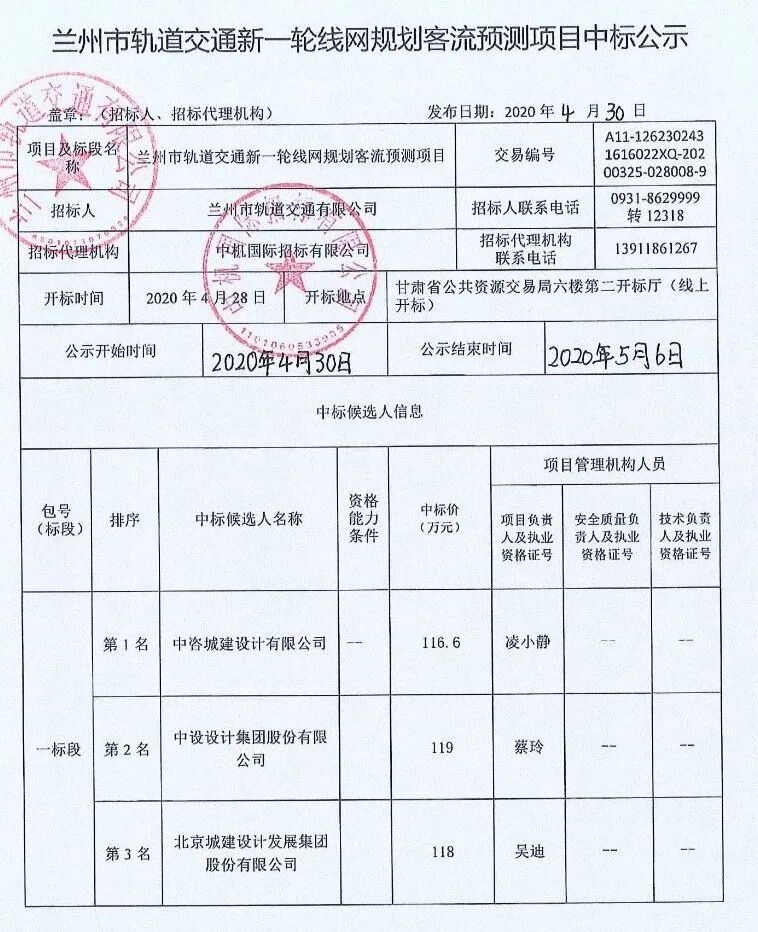兰州市轨道交通新一轮线网规划客流预测项目中标公示