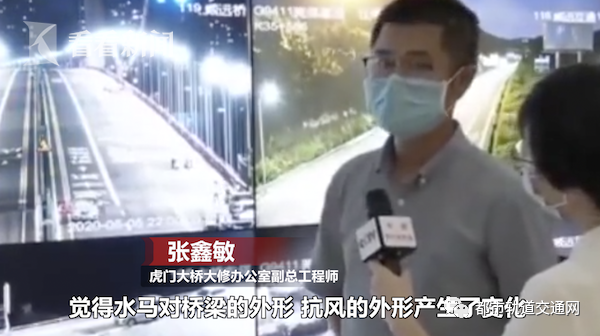 虎门大桥大修办公室副总工程师张鑫敏表示:“我们现在分析的主要原因是,可能当时我们在做桥面检修的工作,当时沿着护栏立柱摆了一层水马,摆了一层水马以后,相当于把护栏立柱的透风孔给堵住了,所以我们通过专家的会议和专家的意见,觉得水马对桥梁的外形、抗风的外形产生了变化,所以产生了涡振。那么现在大家能看到现在桥上是没有水马了,明显涡振的情况好了很多,而且现在的风速比之前下午的风速也低了,所以这两个原因让现在涡振的情况越来越好。为什么现在还有呢?现在目前的抖动可能是惯性的原因,它会慢慢消除了。”