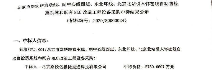 北京市郊铁路京承线、副中心线西延、东北环线、北京北站引入怀密线自动售检票系统和既有MLC改造工程设备采购中标
