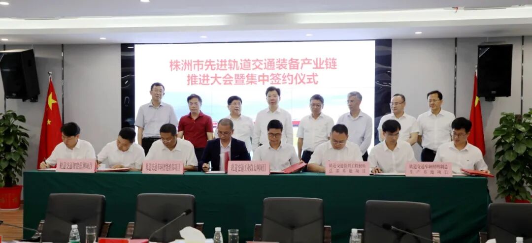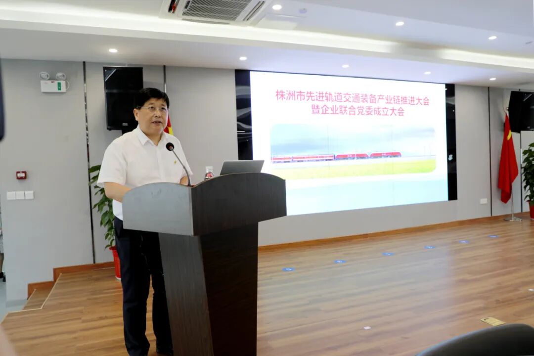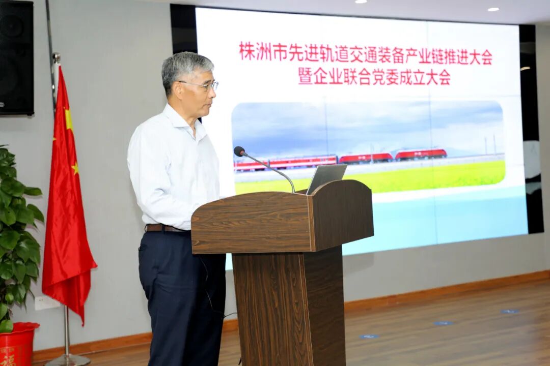 中车株机公司副总经理廖洪涛、顾问李铁生,株洲市直相关部门负责人、石峰区相关负责人,株洲市轨道交通产业链链长制成员、企业联合党委成员、产业协会成员、集中签约代表等参加大会。