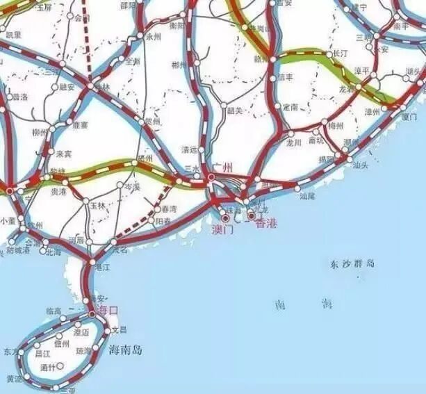 7、包(银)海通道。包头—延安—西安—重庆—贵阳—南宁—湛江—海口(三亚)高速铁路,包括银川—西安以及海南环岛高速铁路。