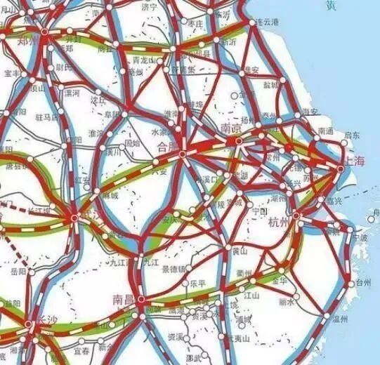 华东的合肥,是高铁新贵,多路。南京由于位置的尴尬,不东不中,地位相对走弱了。在未来城市格局中,同属长三角城市群的合肥、南京的恶战不可避免。从下图也可以看出,长三角高铁密如蛛网。