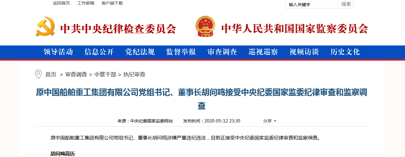 5月12日23时30分,中央纪委国家监委官网发布重磅,原中国船舶重工集团有限公司党组书记、董事长胡问鸣涉嫌严重违纪违法,目前正接受中央纪委国家监委纪律审查和监察调查。
