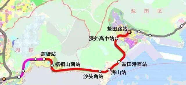 梧桐山南、沙头角、海山、盐田港西、深外高中、盐田路截至目前,车站均已封顶;区间均已洞通;通信、信号设备安装完成。正开展站后铺轨工程、安装工程、装修工程及附属出入口施工。