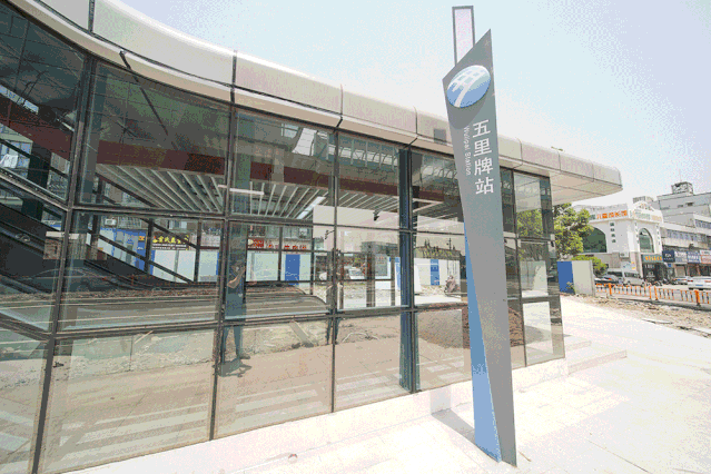高架站五里牌站主体建筑采用局部对称的“飞翼式”布局,层次和动感十足。车站公共区装修延续一期 “甬帮之路”的设计理念。全线造型灵感源自于“甬帮之路”的“路”字,装修设计以交织的线条组合成阡陌交通的概念,烘托“丝绸之路”的意境,体现速度感与时代感。
