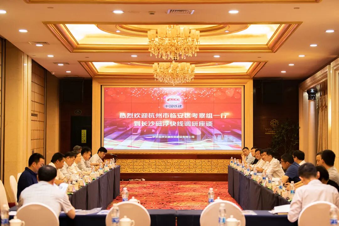 5月14日,杭州市人大常委会副主任、临安区委书记卢春强率考察组一行抵达长沙,对由中国铁建设计施工总承包建设的长沙磁浮快线开展了为期1天的考察调研。中铁磁浮总经理谢海林,中国铁建华东区域总部浙江区域总部执行总经理赵方刚,中铁磁浮副总经理李寒生,纪委书记、工会主席吴兰青陪同调研并参加座谈交流。调研期间,考察组一行首先试乘体验了长沙磁浮快线,随后前往长沙磁浮快线车辆段、OCC控制中心进行参观,在感受中低速磁浮轨道交通带来便利同时,也通过深入交流对中低速磁浮建设、运营有了更深层次的认识和理解。期间举办座谈会,中铁磁浮技术人员汇报了杭州城西科创大走廊磁浮新型市域快线相关工作。双方共同观看了中铁磁浮企业宣传片,并就项目立项、前期研究基础工作、投融资平衡机制、合作模式案例等重点工作进行了探讨交流。