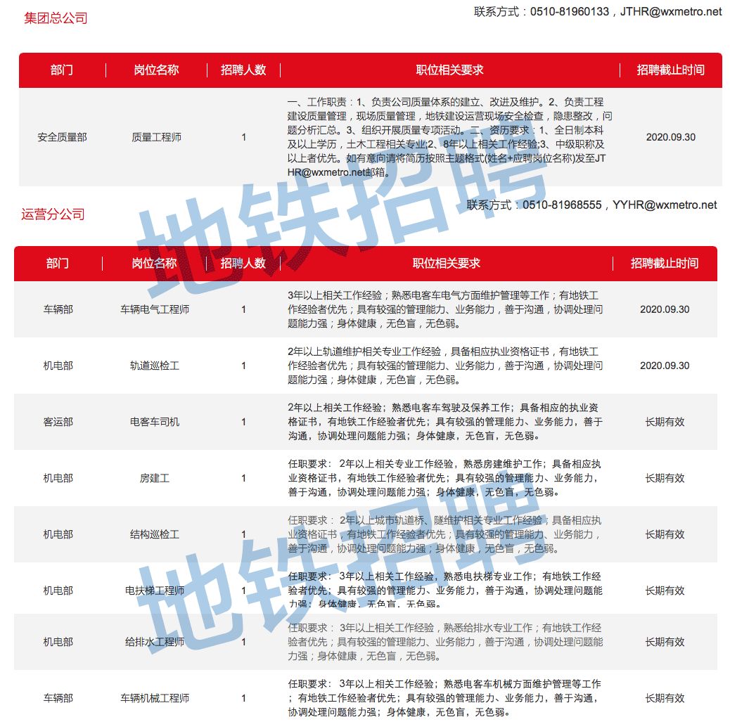 社招!无锡地铁集团有限公司招聘公告 一、 公司简介 无锡地铁集团有限公司是无锡市市属十大国有企业集团之一,成立于2008年,与无锡市轨道交通规划建设领导小组(指挥部)办公室(正处级事业单位)“两块牌子、一套班子”合署办公。公司注册资金57亿元,主要从事城市地铁及其周边资源综合开发利用与附属工程的投资、融资、建设、运营和管理等工作;承担政府下达的其它城市基础设施建设和运营管理职能。集团公司下设建设、运营、资源开发、物业管理、培训、公共自行车、便民服务、锡澄轨道交通等八家子分公司,是一家管理先进、业务多元的大型集团型企业。 社会招聘岗位: