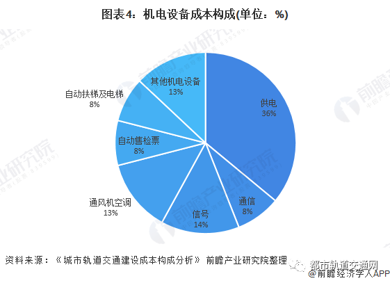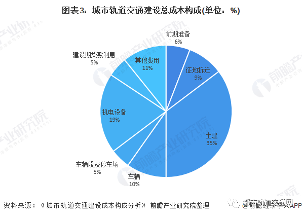根据《城市轨道交通建设成本构成分析》,轨道交通建设总成本主要分为土建工程建设成本、车辆建设成本、机电设备建设成本及其他各项费用;其中占比前三位的分别为:土建成本(36%)、机电设备成本(20%)、车辆采购(10%)。