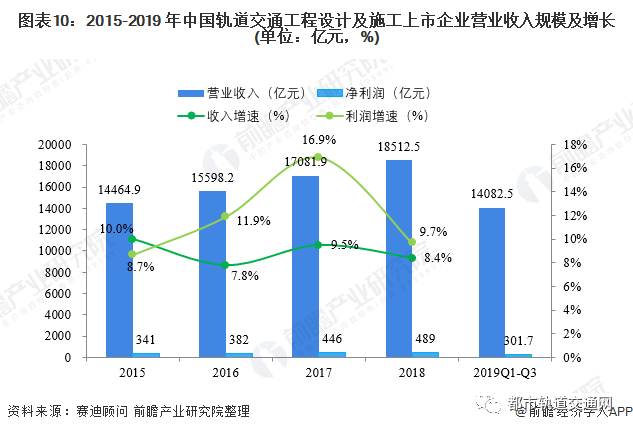 2015-2018年,中国轨道交通工程设计及施工领域上市企业收入和利润均呈逐年增长态势,2019年前三季度这些上市企业营业收入达到1.4万亿元,净利润为386.6亿元。其中,中国中铁和中国铁建是我国轨道交通工程设计及施工领域的“双龙头”,2019年前三季度中国中铁和中国铁建实现营业收入1.1万亿元,占轨道交通工程设计及施工领域上市企业营业收入总额的78.6%,实现净利润301.7亿元,占轨道交通工程设计及施工领域上市企业净利润总额的78%。