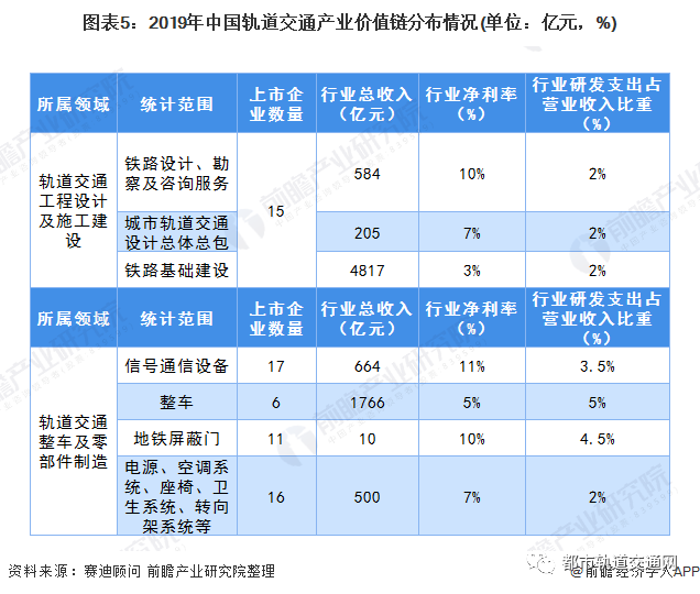 设计咨询是工程开工前期的设计和可行性咨询环节,包括咨询、规划、勘察、测量和设计等域;工程建设指轨道交通项目施工环节,可分为工程建设总承包、土建施工和机电安装,安装机电包括通信、信号、牵引供电和电力供电系统,即“四电集成”工程;装备制造主要指轨道交通的车辆系统和机电系统的制造,涉及机械制造、电子信息、高分子材料等多个领域:运营维护及增值服务,包括轨道交通传统的运营管理和物业、广告、媒体商业、资源开发等行业。