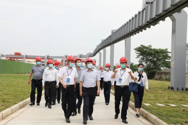 5月20日,湖北省副省长曹广晶一行到中铁科工集团江夏制造基地调研新基建项目建设,并试乘体验“新时代号”空轨。
