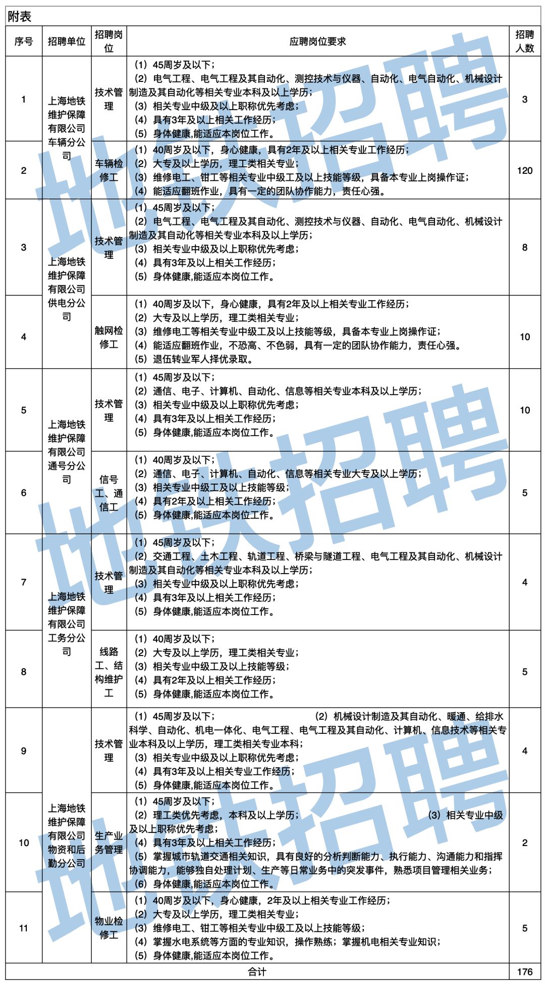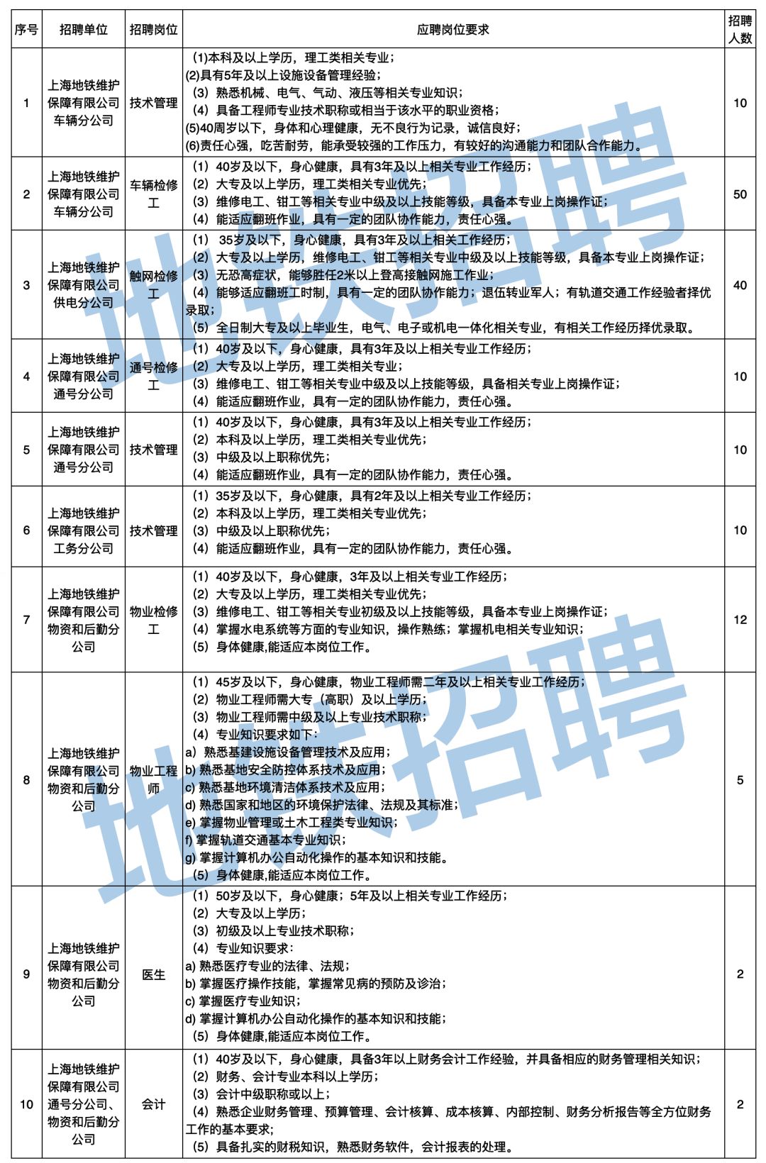为适应超大规模轨道交通网络运营的人才需求,上海申通地铁集团有限公司下属上海地铁维护保障有限公司面向社会招聘运营维护保障专业人员,具体事项如下: