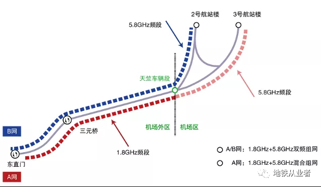 为解决地铁1.8GHz频率使用不能进入机场地区的问题,京投新岸线公司创新提出了A网(红网) 1.8GHz+5.8GHz分区域混合组网,即机场外区域使用1785-1795MHz专用频率,进入机场区域后使用5830-5850MHz开放频率,运行列车在过渡区间切换时间小于100ms,满足列控CBTC业务承载需求,有效地解决了城市轨道交通1.8GHz频率在机场等区域使用受限问题。