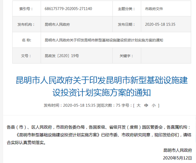 5月18日,昆明市人民政府发布了《关于印发昆明市新型基础设施建设投资计划实施方案的通知》。计划投资10011.8亿元在轨道和航空基础设施等五大领域实施394项重点项目,其中提到要计划新建3条城际铁路,总投资金额约561亿元。