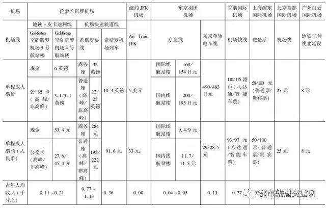 由于机场线服务的对象与一般城区地铁不同,机场线的票价与地铁存在较大差异。表8给出了部分机场线的票制票价及特色服务情况,可以看出,当机场线专线专用时运量较低,对应的票价较高。比较可知,国外机场线票价从面值来分析,除伦敦外均低于我国主要机场线的票价;从占人均收入比例来看,东京与纽约的机场线票价占年人均收入的千分之零点一左右。