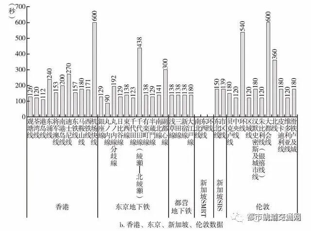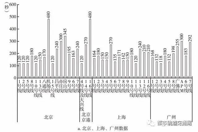 图1给出了统计到的北京上海广州香港东京新加坡伦敦7个城市约80条线路的列车发车间隔数据。其中,高峰时期最小发车间隔在200秒以内的有57条线路,其中发车间隔最小的为东京丸之内线,仅90秒;国内城市中,香港地铁和广州地铁的发车间隔最小,分别为112秒和118秒。