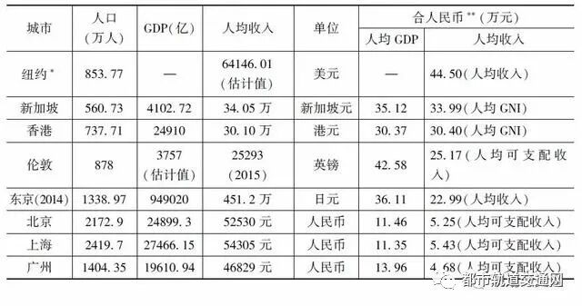 表3给出了8个城市的人口、GDP和人均收入情况,其中后三列为折合人民币后的数据。可以看出,北京、上海和广州三个城市的人均GDP仅为其他城市的30%左右,人均收入约为25%。