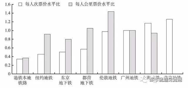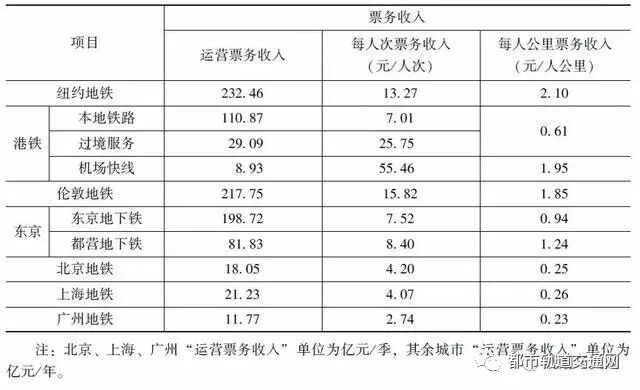 比较按单位周转量测算的票务收入可以发现,各城市的排序情况类似,纽约和伦敦票务收入水平最高,东京其次,香港较低,上海和广州的票务收入水平最低。