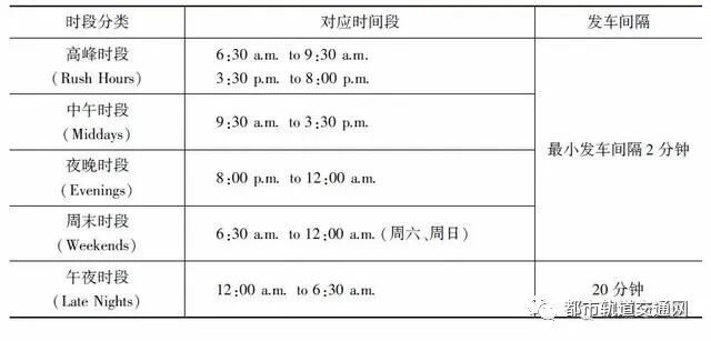 纽约市地铁多数线路为四线并行,通宵运营的情况更为普遍。纽约地铁目前提供每周7天每天24小时的运输服务,MTA(纽约交通管理署)将每天的运营时间按是否为工作日划分为5个时间段,采取不同的运营模式和发车间隔,具体如表10所示。