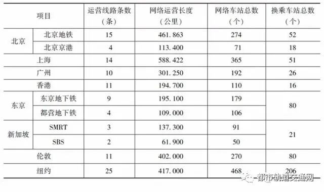 注:①香港10条铁路线为187.4公里,机场线(35.2公里)大部分路轨与东涌线共用,铁路系统总长230.9公里,其中轻轨36.2公里,因此10条铁路线加机场快线为194.7公里。②香港线路车站数求和为113个,但机场快线与东涌线共用3个车站,因此网络车站总数为110个。