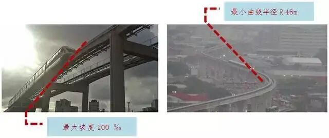 值得一提的是,庞巴迪INNOVIA Monorail 300采用更小体量的单轨梁,并通过尽量轻化梁重,尽可能减小柱子和地基的静荷载。更小体量的梁设计可令跨度长达30-36米,提高了将单轨结构融入现有的街道网或交叉路口时的灵活性,也降低了对驾车人员和行人的视线阻碍。 另外,车辆采用橡胶车轮,列车在运行时噪声低、振动小,乘客乘坐也更为舒适。 单轨的轨道梁可以提前预制,施工过程中利用夜间架设,这样线路建设周期能够小于地铁建设周期的一半。做一个非常实际的造价计算:地铁的造价超过人民币6亿/公里,常规的轻轨约4-5亿/公里,而单轨每公里造价约2-3亿/公里。 跨座式单轨最大爬坡能力可达100‰,最小曲线半径仅需46m。占地少,可利用道路中央绿化带进行敷设。较地铁轻轨而言,更能适应复杂的地形地貌环境,有效减少征地拆迁工程,从而节省工程投资和避免拆迁纠纷。