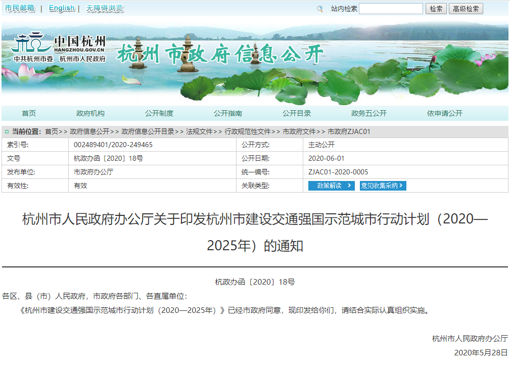 6月1日,杭州市人民政府办公厅正式印发《杭州市建设交通强国示范城市行动计划(2020—2025年)》。