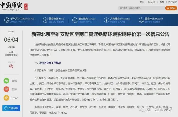 雄安高速铁路有限公司委托中国铁路设计集团有限公司开展“新建北京至雄安新区至商丘高速铁路”环境影响评价工作,根据《环境影响评价公众参与办法》,为使公众了解、参与本项目的环境影响评价工作,现将建设项目概况、建设单位、环境影响报告书编制单位等信息公示如下: