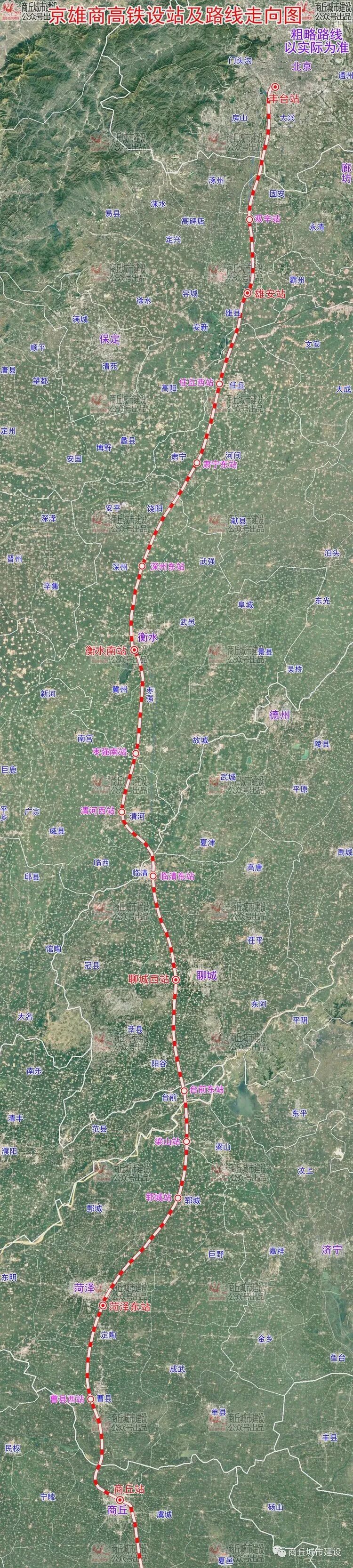 全线共设北京丰台、双辛、雄安、任丘西、肃宁东、深州东、衡水南、枣强南、清河西、临清东、聊城西、台前东、梁山、郓城、菏泽东、曹县西、商丘站17个车站。