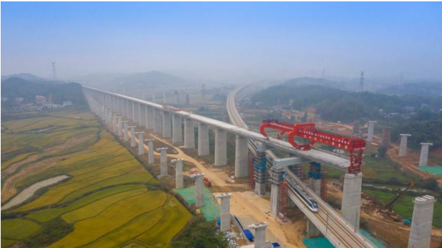 图为乌山联络线动车穿过正在架梁中的常益长高铁黄桥大道特大桥。 彭特 摄 中新网武汉10月13日电 (蒲旺 于瑞 徐金波)经过连续3个晚上3次封锁施工,由此间中铁十一局承建的湖南常(德)益(阳)长(沙···