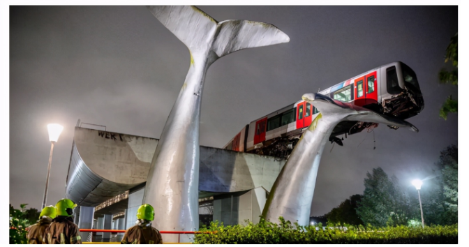 导读ID:Rail-Urban堪比大片现场:荷兰一地铁列车午夜脱轨 被鲸鱼尾巴雕塑“拯救”当地时间11月2日,荷兰鹿特丹附近Spijkenisse市,一列地铁列车冲出轨道,挂在De Akkers站附近···
