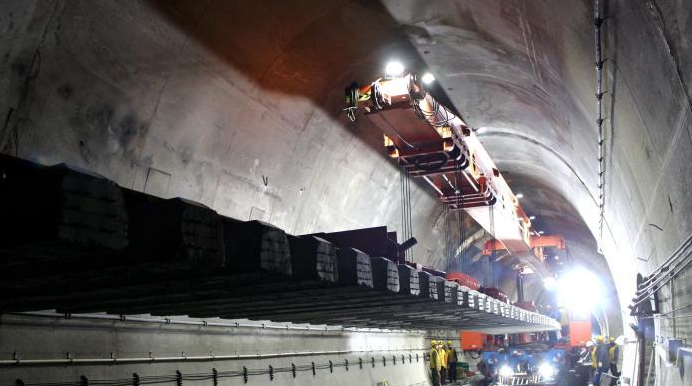 图为川藏铁路拉林段施工人员开始进行达嘎拉隧道的铺轨作业。李驰 摄 中铁十一局20日透露,目前川藏铁路拉林段已铺轨63%,到达林芝市朗县达嘎拉隧道,该隧道全长约17公里,预计10月21日完成隧道内的铺···